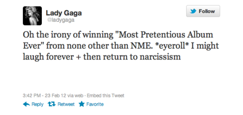 Gaga no se ha quedado callada y ha twiteado lo siguiente "Oh, la ironía de ganar el disco más pretencioso del año por la mismísima NME "eyeroll" me podría estar una eternidad riéndome y después volvería a mi narcisismo". No sabemos si realmente está cabreada o realmente aún cree que 'Born This Way' es el mejor CD de la década, lo que está claro es que gracia, lo que se dice gracia, no le ha hecho.