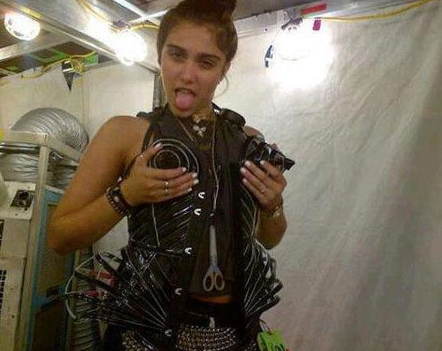 Aquí arriba tienes a la hija de la material girl probándose la vestimenta/armatroste metálico de Jean Paul Gaultier con los pechos cónicos que la cantante de 'Vogue' durante esta gira. Esperamos que mamá Madonna, que no es muy amiga de las redes sociales e internet, no se entere de esta foto y no tenga que volver a castigar a Lourdes María por jugar con el equipo de trabajo de su progenitora.