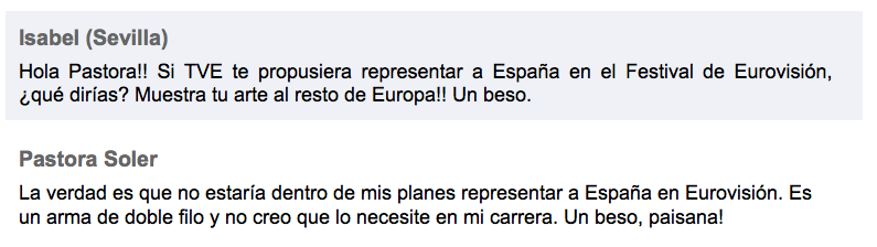 La cantante escogida por RTVE (y anunciada por la ex presentadora de 'Andalucía Directo') para representar a España en Eurovisión 2012 declaró hace muy pocas semanas (tal y como ha descubierto Vertele) que "Eurovisión es un arma de doble filo. No lo necesito para mi carrera". No sabemos qué habrá podido pasar para que la sevillana Pilar Sánchez Luque (nombre de Pastora) haya cambiado de opinión.