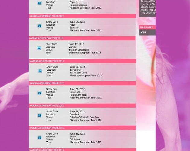 Supuestamente extraído de un link aún escondido en madonna.com, la página nos muestra las ocho primeras fechas de la gira en europa. Podemos estar contentos ya que viene a Barcelona y no lo hace una, sino dos veces, el 20 y 21 de junio, en el Palau Sant Jordi. No sólo eso, sino que somos el único país en el que actúa en un estadio menor y la única ciudad que repite. ¿Será verdad? Si es mentira, está bien montado, porque ya sabemos que Madonna nunca actúa en viernes. Aquí tienes el total de conciertos de junio de Madonna: