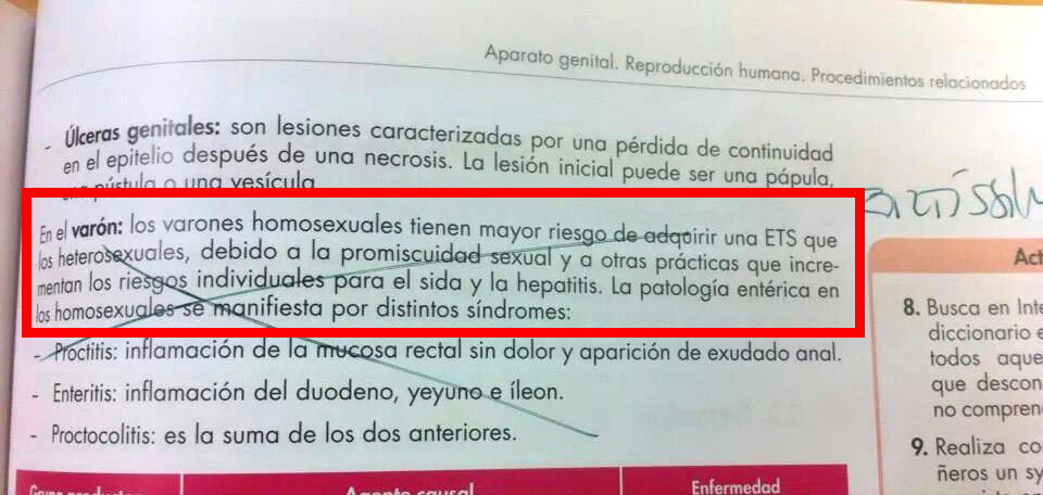 Los libros de educación también presumen a veces de su homofobia y consiguen ser titulares en noticias por fomentar el odio sin sentido. Este manual de enfermería se quedaba más ancho que largo relacionando las ETS con la homosexualidad. Como si los heteros no pillaran enfermedades de transmisión sexual.