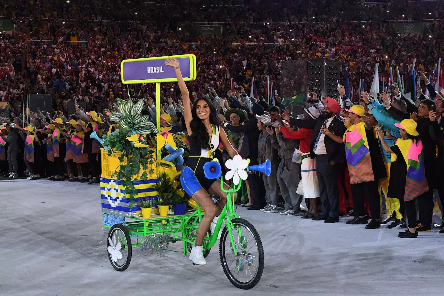 La supermodelo, cuyo nombre completo es Leandra Medeiros Cerezo, participó con una espectacular carroza en la ceremonia de apertura, encabezando el equipo brasileño.