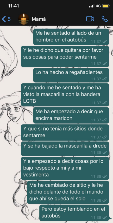 La conversación de la que habla en el twit la vemos en el siguiente pantallazo, en el que mantiene un chat de Whatsapp con su madre: “Me he sentado al lado de un hombre en el autobús y le he dicho que quitara, por favor, sus cosas para poder sentarme. Lo ha hecho a regañadientes. Y cuando me he sentado y me ha visto la mascarilla con la bandera LGTB, me ha empezado a decir que encima maricón y que si no tenía más sitios donde sentarme. Y se ha bajado la mascarilla adrede y a empezado a decir cosas por lo bajo respecto a mí y a mi vestimenta. Me he cambiado de sitio y le dicho delante de todo el mundo que ahí se queda él solo. Pero estoy temblando en el autobús”.