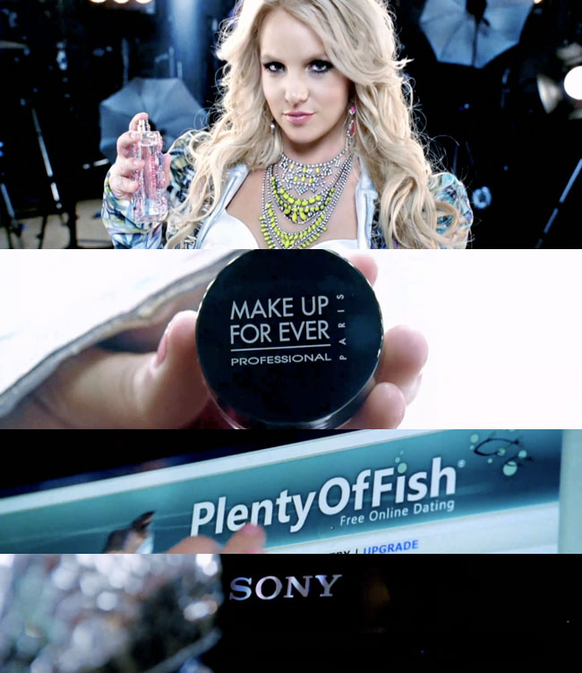 A estas alturas nos parece bastante pretencioso llamar a esto 'product placement' porque ya todo el mundo sabe lo que es y no suena nada cool. Es la publicidad de toda la vida. El vídeo 'Hold It Against Me' lo han pagado la empresa de perfumes que lleva a Britney, Make Up Forever, la web de contactos PlentyOfFish y Sony, entre otros. Gracias al montaje de infarto de Jonas casi pasan todas desapercibido. La más graciosa es la de 'Radiance', con la cara de niña que pone Brit.