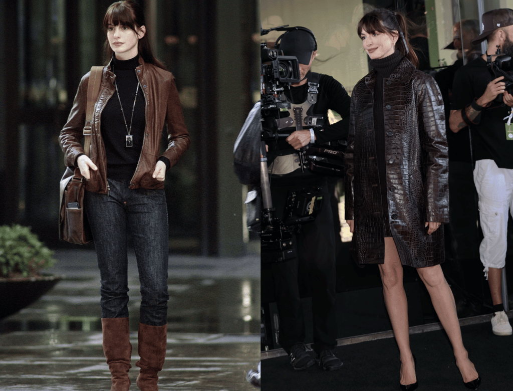 Andy, perdón, Anne Hathaway llevaba un cuello alto negro con una chaqueta de cocodrilo marrón, completa con flecos de la época de 2006.