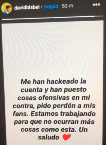 Por suerte el artista almeriense se dio cuenta rápidamente, pudo corregirlo antes de dirigirse a sus seguidores confirmando el delito cibernético. @Me han hackeado la cuenta y han puesto cosas ofensivas en mi contra, pido perdón a mis fans. Estamos trabajando para que no ocurran más cosas como esta. Un saludo”, publicaba Bisbal en una story.