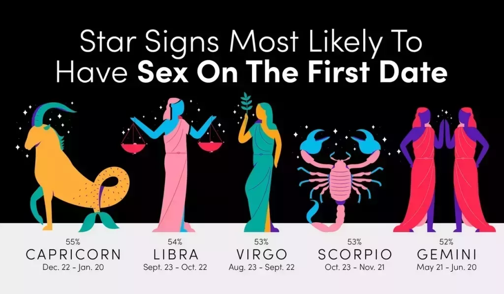 Y si eres un entusiasta de los signos zodiacales, también descubrieron que los Capricornio (55%) y los Libra (54%) se llevaban la palma en lo que a sexo en la primera cita se refiere.