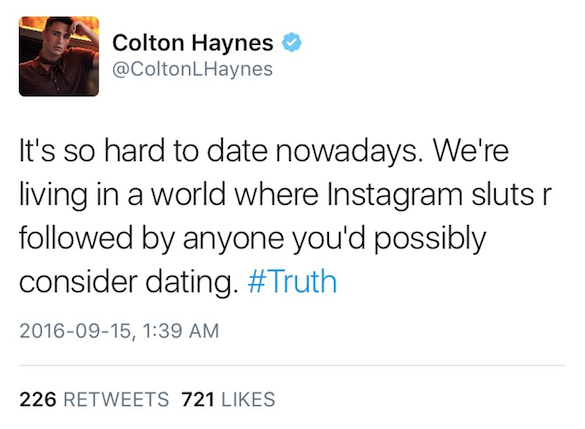 "Es tan difícil ligar hoy en día. Vivimos en un mundo donde las zorras de Instagram son seguidas por cualquier persona que podría convertirse en tu pareja #Verdad"