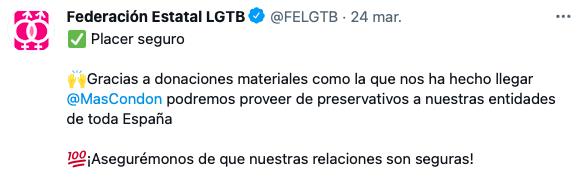Una de las acciones más significativas fue su colaboración con FELGTB, aportando una donación que hizo posible mantener seguras todas las entidades repartidas por toda España: