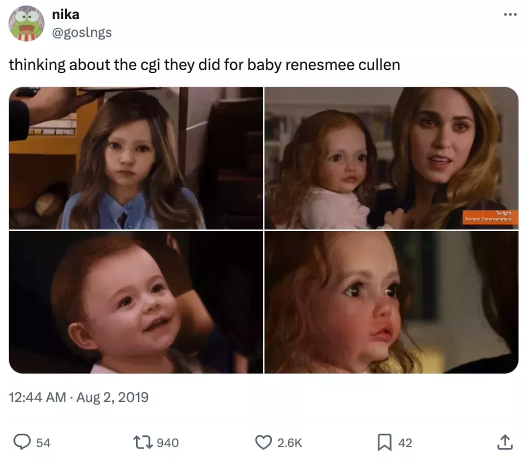 En la película, Renesmee, de bebé, cobraba vida gracias a un cuestionable CGI, que desde entonces se ha convertido en meme hasta el olvido.