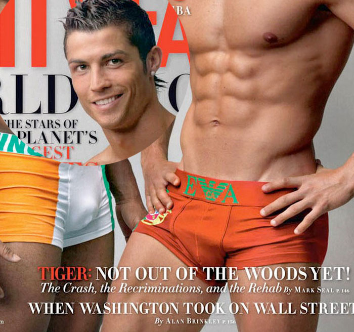La portada entera nos descuadraba un poco la imagen principal así que le hemos recortado la cabecita y se la hemos puesto al lado del cuerpo. Las nuevas fotos de Cristiano Ronaldo en calzoncillos no son tan impactantes como las que vimos para Armani hace unas semanas pero no están nada mal. Cristiano nunca defrauda.