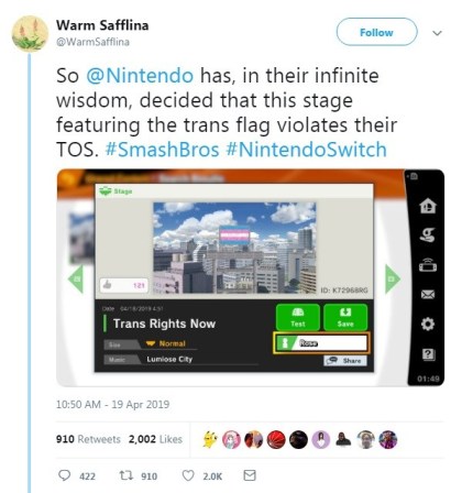 Gamer Warm Safflina recurrió a los medios sociales para preguntar directamente a Nintendo qué era lo'tan dañino' de su escenario (Twitter)