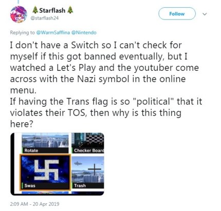 Otro se preguntó cómo podían seguir viendo otros símbolos políticos más estereotipados -como una bandera nazi- dentro del juego si la bandera trans se consideraba inapropiada.