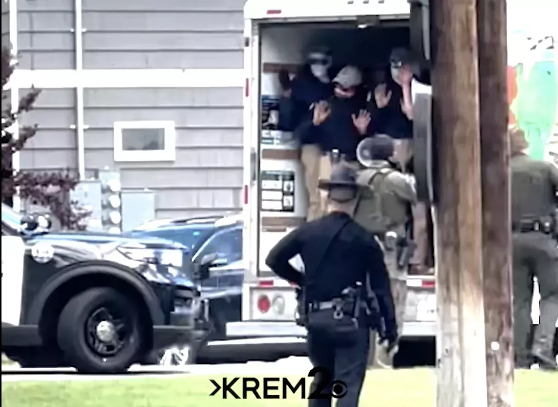El jefe de la policía de Coeur d'Alene, Lee White, dijo que sobre las 13.38 horas de esta tarde recibieron una llamada telefónica de un ciudadano preocupado que vio a unas 20 personas con máscaras y escudos saltando a un camión Uhaul.