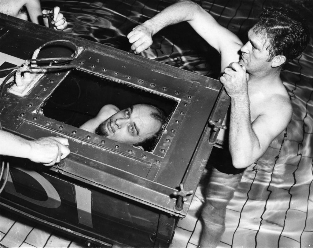 El Asombroso Randi se asoma al ataúd sellado en el que intentará romper su propio récord de resistencia de permanecer dos horas bajo el agua. (Ron Burton/Getty Images)