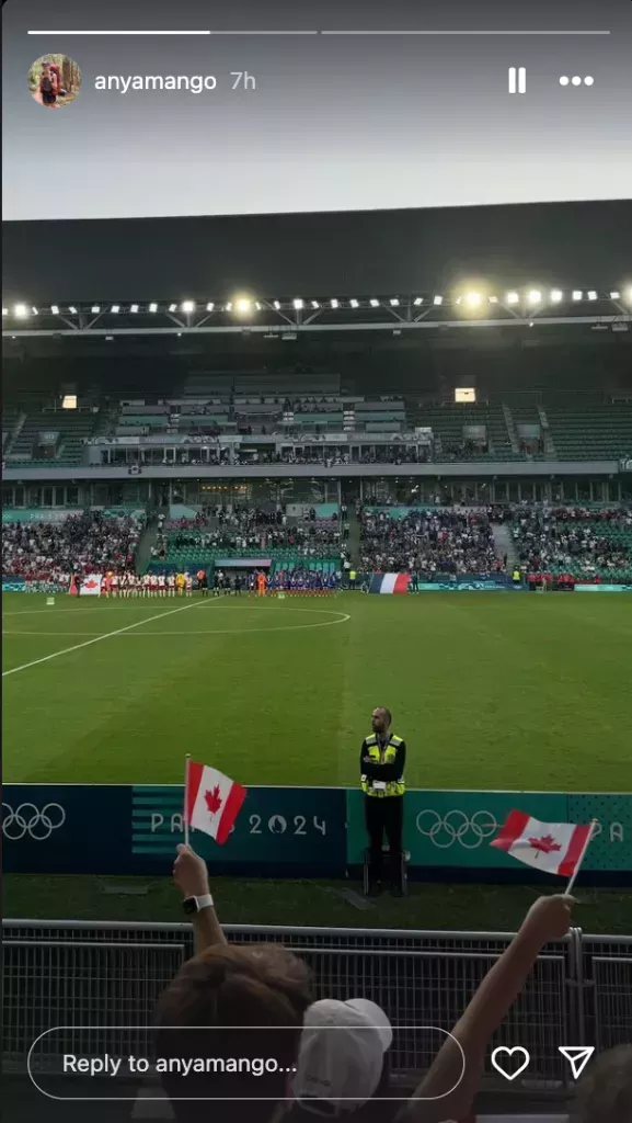 Al comenzar los Juegos Olímpicos de París 2024, Anya compartió una historia de Instagram en la que aparecía en el estadio olímpico de fútbol mostrando su apoyo a Quinn, con banderas canadienses visibles en primer plano. Canadá venció a Francia por 2-1 en el emocionante partido celebrado ayer (28 de julio).