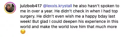 Julz primero corrigió los informes de los medios sobre su identidad de género, escribiendo: “De hecho, soy trans masc y uso pronombres he/they”, bajo la publicación del 3 de mayo.