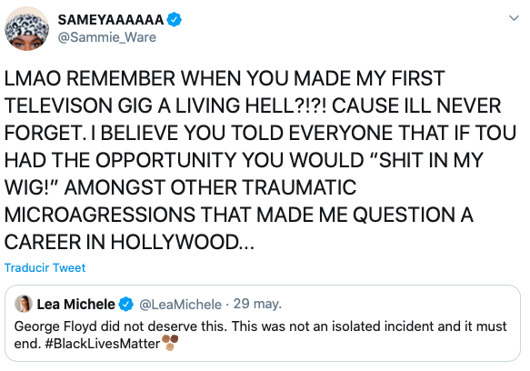 Samantha Ware compartió su historia después de que Michele twiteara un mensaje de Black Lives Matter. "¿¡IMAO, RECUERDAS CUANDO HICISTE DE MI PRIMERA ACTUACIÓN EN TELEVISIÓN UN INFIERNO!? PORQUE NUNCA OLVIDARÉ. CREO QUE LE DIJISTE A TODO EL MUNDO QUE SI TUVIERAS LA OPORTUNIDAD TE "CAGARÍAS EN MI PELUCA". ENTRE OTRAS MICROAGRESIONES TRAUMÁTICAS QUE ME HIZO PREGUNTAR UNA CARRERA EN HOLLYWOOD" Ware escribió.