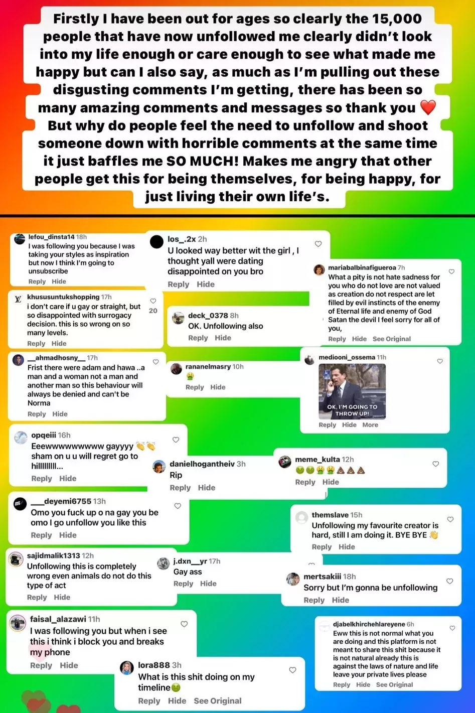 "Realmente me preparé hasta un punto en el que me sentí capaz de hacerlo, independientemente de cuánta gente pudiera dejar de seguirme o de lo que la gente pudiera decir. Cuando leí estos comentarios, me dije: '¿De dónde viene este odio? ¿Por qué la gente tiene la cabeza tan pequeña?