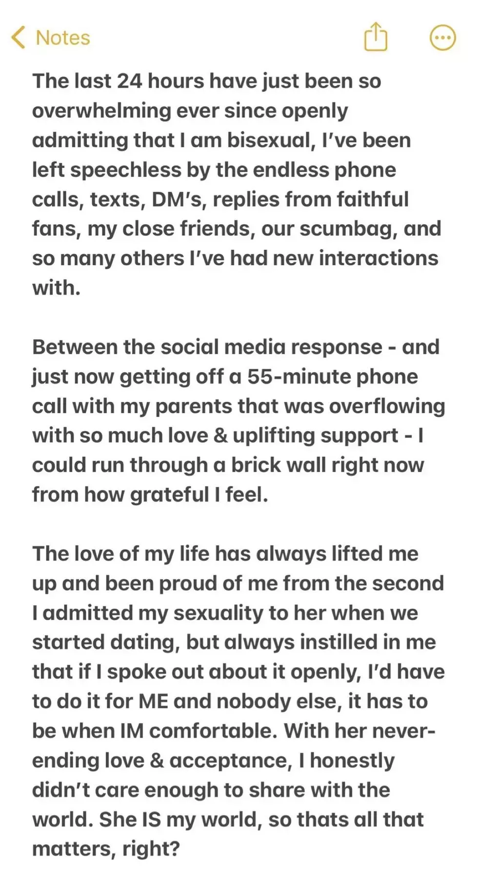 Y añadió: "El amor de mi vida siempre me ha apoyado y se ha sentido orgullosa de mí desde el momento en que le confesé mi sexualidad cuando empezamos a salir, pero siempre me inculcó que si hablaba abiertamente de ello, tendría que hacerlo por MÍ y por nadie más, tiene que ser cuando me sienta cómodo. Con su amor y aceptación sin fin, sinceramente no me importaba lo suficiente como para compartirlo con el mundo. Ella ES mi mundo, así que eso es lo único que importa, ¿no?".
