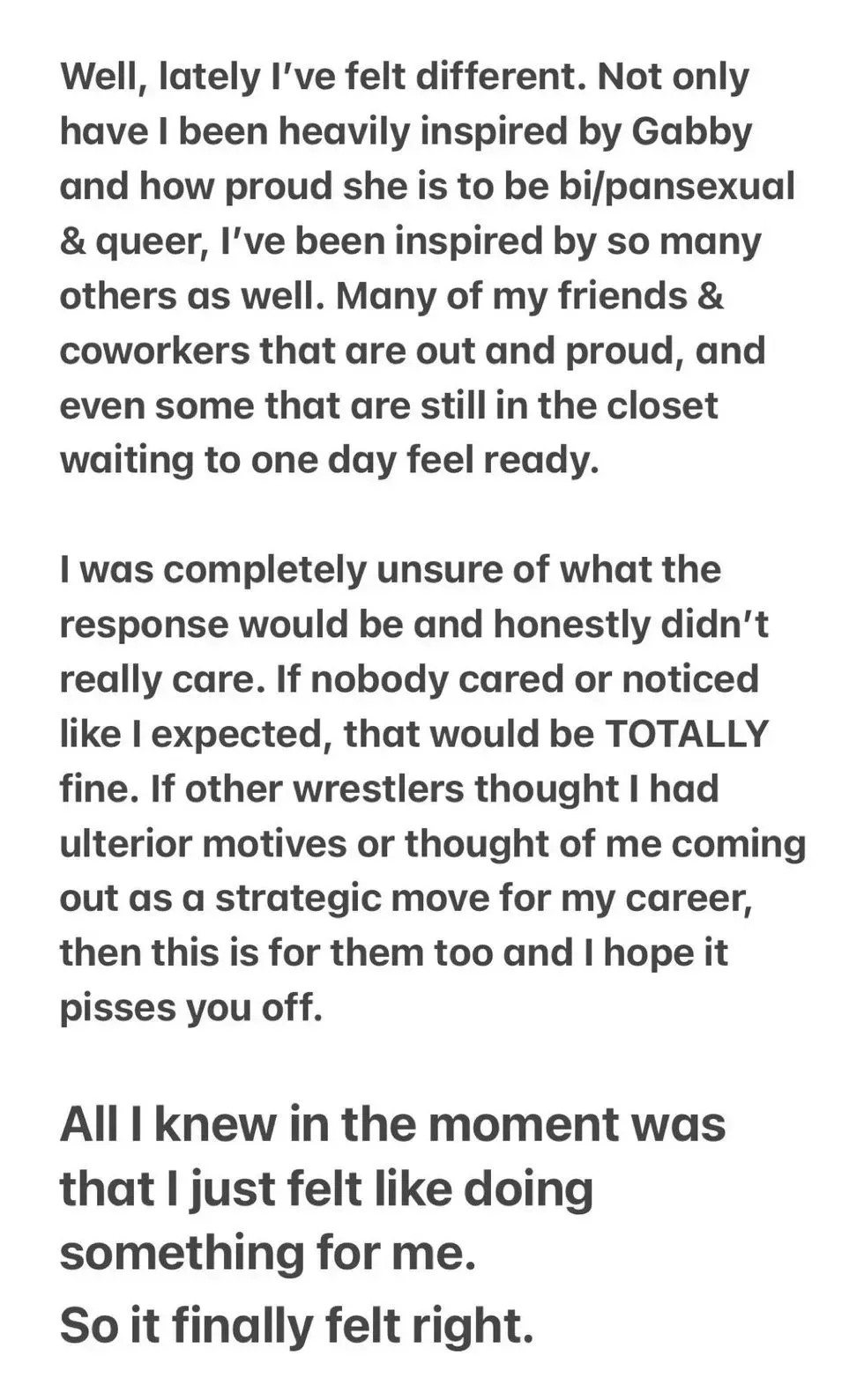 "Estaba completamente inseguro de cuál sería la respuesta y honestamente no me importaba realmente", continuó. "Si a nadie le importaba o lo notaba como yo esperaba, eso estaría TOTALMENTE bien. Si otros luchadores pensaban que tenía segundas intenciones o pensaban que mi salida del armario era un movimiento estratégico para mi carrera, entonces esto es para ellos también, y espero que les joda. Todo lo que sabía en ese momento era que me apetecía hacer algo por mí. Así que por fin me pareció bien".