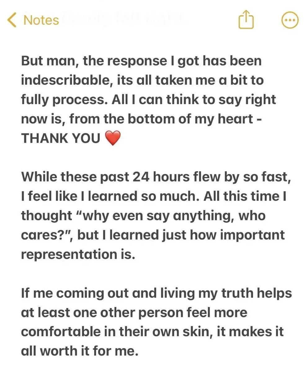 "Aunque estas últimas 24 horas han pasado volando, creo que he aprendido mucho", añade, "y todo este tiempo he pensado: '¿Para qué decir nada, a quién le importa? Si salir del armario y vivir mi verdad ayuda al menos a otra persona a sentirse más cómoda en su propia piel, para mí merece la pena".