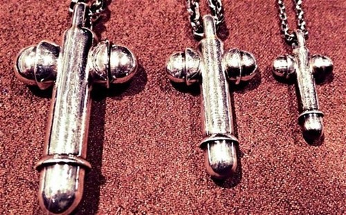 El grito está puesto en el cielo. ¿Es correcto vender un collar con forma de polla y crucifijo? ¿Es correcto hacerlo a 800 dólares? Aquí tienes el miembro en cuestión, a diferentes tamaños: