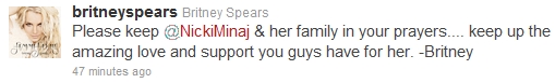 Nicki Minaj ya puso la noticia en su twitter y las muestras de condolencia han sido masivas. Una de las más queridas ha sido la de Britney Spears, compañera suya de tour, que mandó el siguiente mensaje: