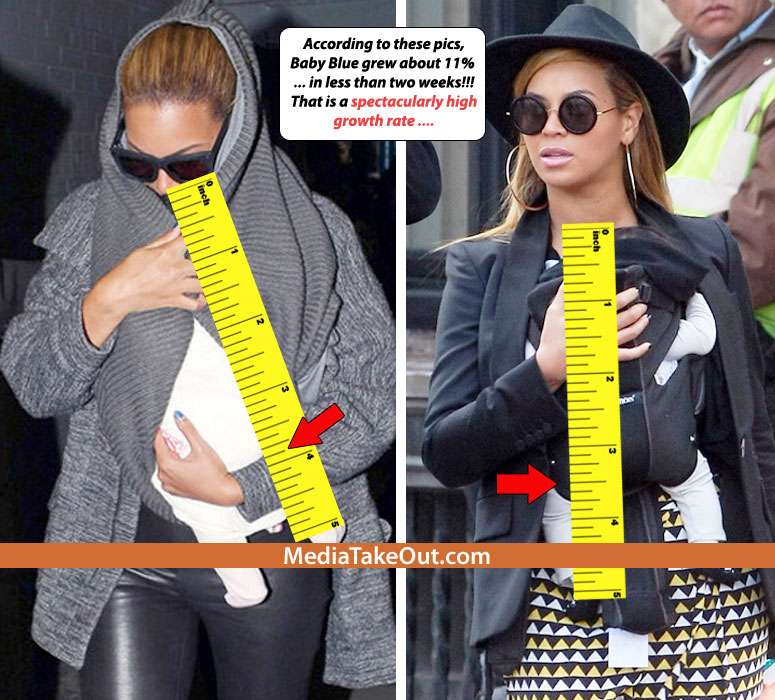 Una cosa es que juegues con el rumor de que su embarazo no fue real y contrataron a una madre de alquiler, pero que salga a pasear a una muñeca pierde todo sentido y vende a Beyoncé como una locatis de cuidado. Incluso se preocupan en comparar dos imágenes relativamente parecidas para demostrar que el bebé ha crecido demasiado en dos semanas. Para redondearlo, muestran que hoy en día se fabrican muñecas bebé tan reales que no te lo crees hasta que no ves que no se mueve.