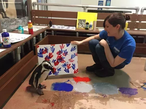 Green Bean también es una talentosa pintora, al igual que algunos de sus amigos emplumados. El Acuario de Newport crea obras de arte permitiendo que las pingüinas corran sobre pintura y papel, explicando: "La enriquecimiento se trata de proporcionar a los animales entornos, objetos y actividades estimulantes y desafiantes. Su objetivo es aumentar su actividad y proporcionar estimulación mental para las pingüinas. ¿Quién no se divertiría pisoteando y salpicando pintura?"