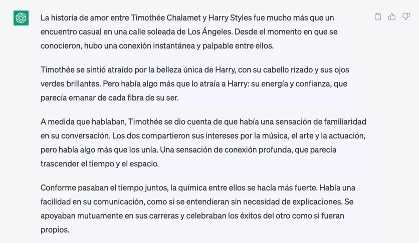 Y la cosa no acaba ahí. ChatGPT también compartió este cursi argumento sobre la pareja que hizo pública su relación: "Se convirtieron en una inspiración para muchos, demostrando que el amor no conoce fronteras y que merece la pena luchar por él".