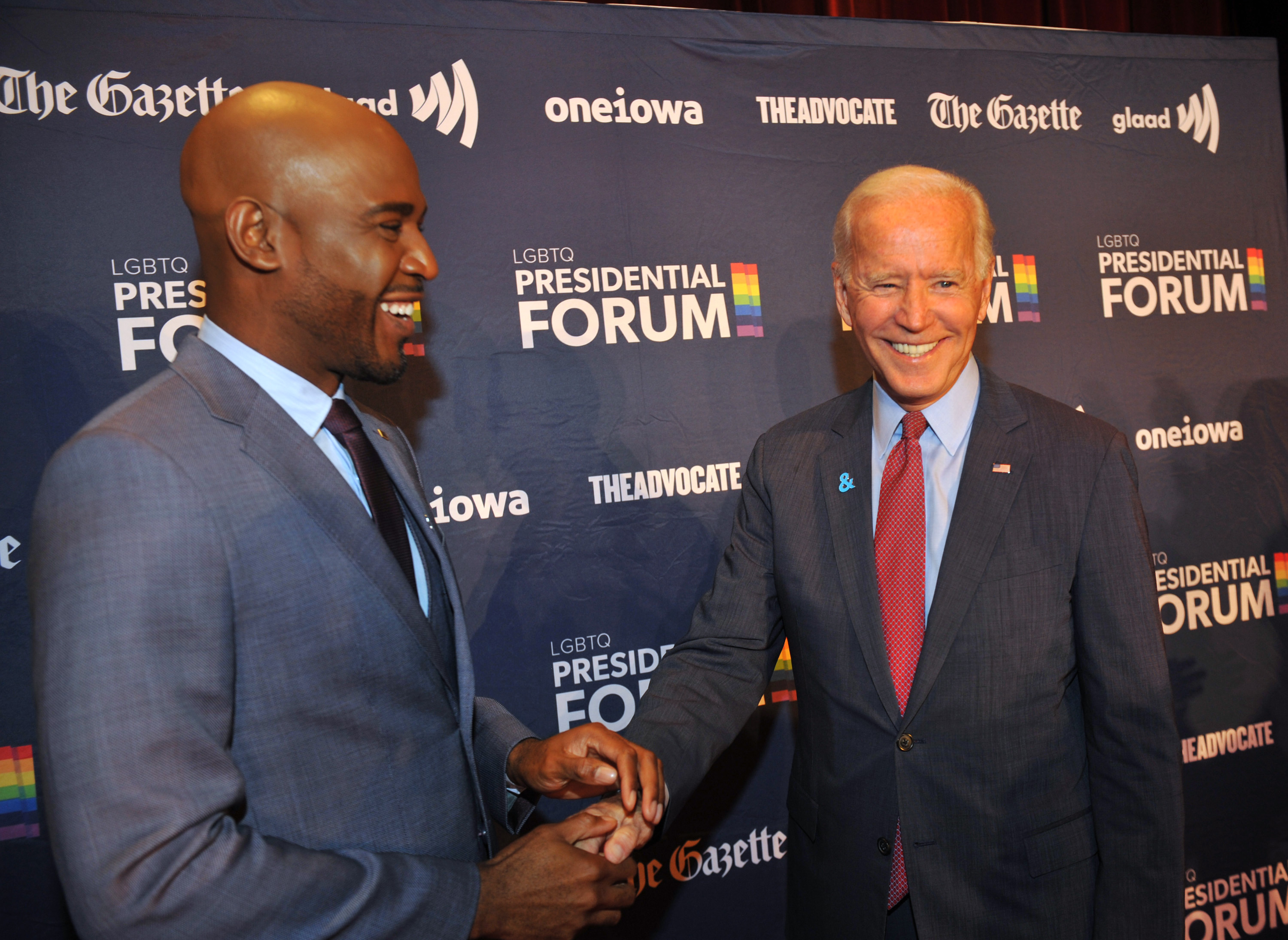 Karamo, de Queer Eye, y el vicepresidente Joe Biden posan para una foto entre bastidores en el Foro de Candidatos Presidenciales sobre temas LGBTQ.
