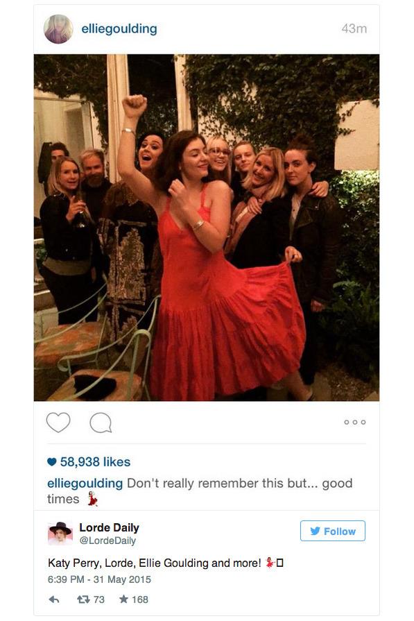 De amigas a enemigas en cero coma. Ellie Goulding podría haber hecho cabrear y mucho a su amiguísima Taylor Swift con una foto en la que aparece junto a Lorde en una fiesta. Hasta aquí no debería haber problema: Ellie y Lorde son amiguísimas de Taylor, hacen mil fiestas juntas, ruedan vídeos, etc. Pero el problema es otra chica que sale en la foto. Katy Perry: