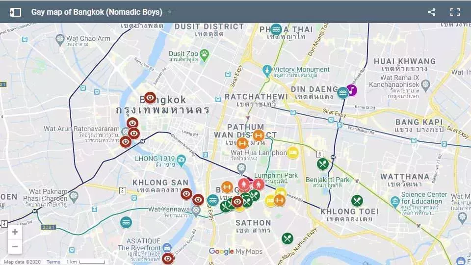 Este es un mapa detallado de Bangkok Gay que incluye nuestros hoteles gay friendly, bares y discotecas gay favoritos, así como las mejores cosas que hacer en Bangkok. Utilízalo para planear tu propio viaje gay a esta excitante ciudad