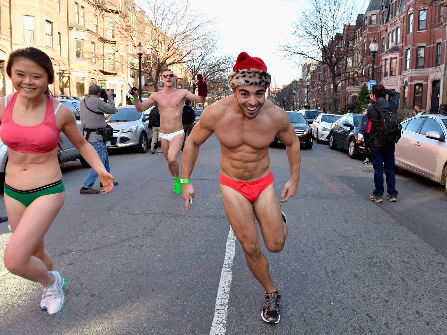 Hombres en Speedo corriendo en la Boston Santa Speedo Run 2015