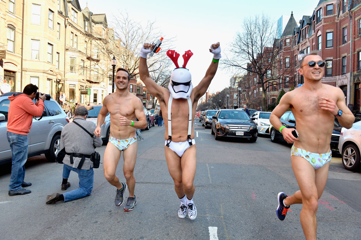 Hombres en Speedo corriendo en la Boston Santa Speedo Run 2015