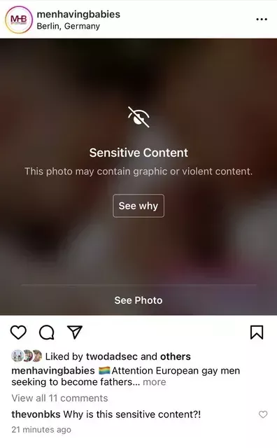 Instagram censuró una foto de dos padres homosexuales con su bebé recién nacido en brazos, alegando que se trataba de un contenido "gráfico" y "perturbador".