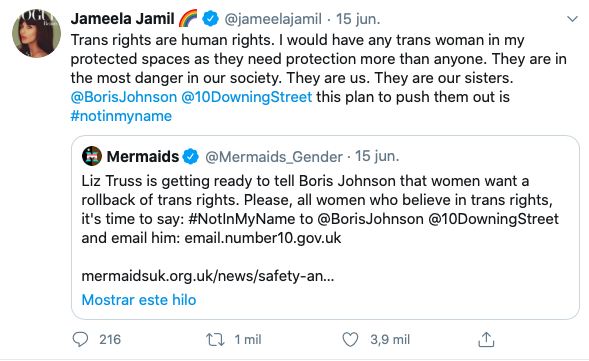 Hoy en día, usando el hashtag #NotInMyName, las mujeres cisgénero están saliendo en apoyo de los derechos de los trans y particularmente en defensa de las mujeres trans, que son las más afectadas por el último ataque a la igualdad en el Reino Unido. "Los derechos de los trans son derechos humanos", Jameela Jamil twiteó ayer (15 de junio). "Tendría a cualquier mujer trans en mis espacios protegidos ya que necesitan protección más que nadie. "Son los más peligrosos de nuestra sociedad. Ellos son nosotros. Son nuestras hermanas. Boris Johnson, este plan para expulsarlas es "No en mi nombre".