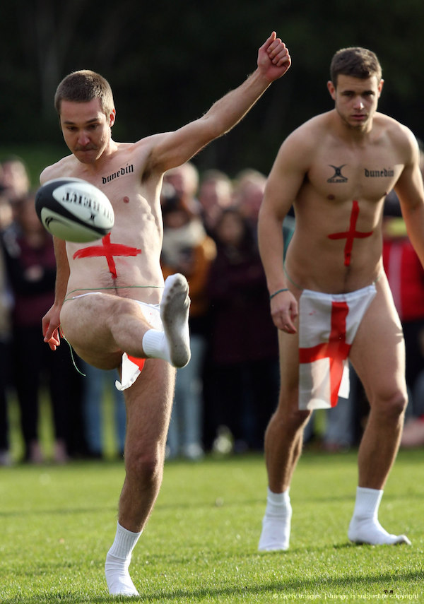 Jugadores de rugby desnudos neozelandeses e ingleses en un partido