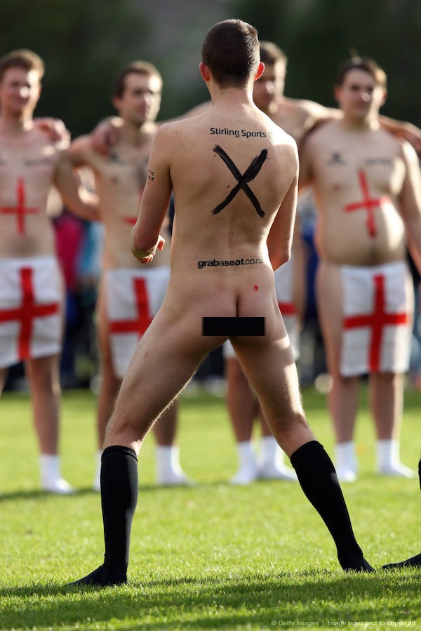 Jugadores de rugby desnudos neozelandeses e ingleses en un partido
