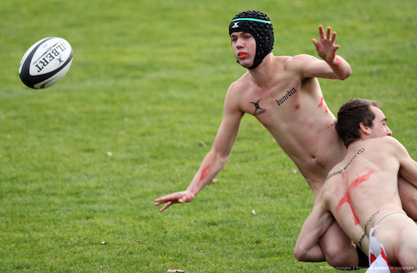 Jugadores de rugby desnudos neozelandeses e ingleses en un partido
