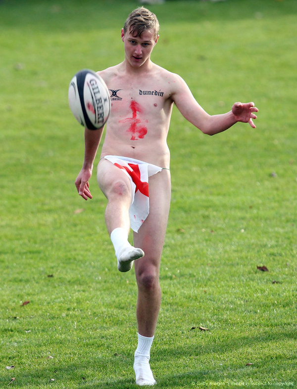 Jugadores de rugby desnudos neozelandeses e ingleses en un partido