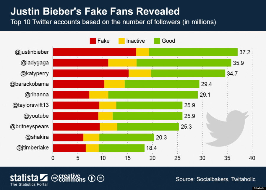 El pasado mes de agosto te contábamos como, según un estudio, el 71% de las cuentas de Twitter que seguían a Lady Gaga eran falsas. Pero las cosas como son: hoy te traemos un estudio de 'Statista', un portal de estadísticas, que ha recogido la vida de los followers de los principales artistas mundiales con Twitter y la ha plasmado en una gráfica de lo más clara: