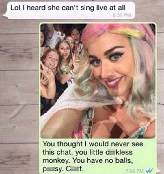 Además, momentazo en su última parada en Melbourne: cazó a una fan hablando por el móvil con el novio, que había escrito "LOL he oído que esa no canta en directo", y la propia Katy se hizo una selfie y le soltó esto: