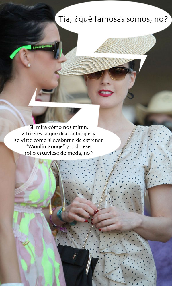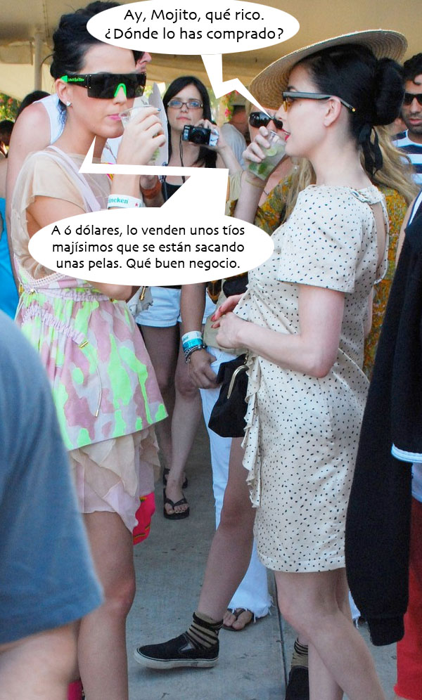Las famosas no tienen problemas para socializar con ejemplares de su misma especie. Katy Perry y Dita Von Teese se encontraron ayer en el festival de Coachella y hablaron animadamente como si fuesen amigas de toda la Santa vida. Compartieron unos mojitos que eran puro hielo riquísimos, de esos que venden en los festivales por 6 euros y dices "Uy, qué barato el Mojito, me voy a pedir uno", y charlaron sobre los conciertos que habían visto.