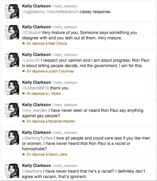 Kelly Clarkson se ha quedado a gusto en Twitter al reconocer que está enamorada de Ron Paul y defendiéndole. El problema es que Ron Paul es un político republicano de ideas férreas, que no encajan, en principio, con lo que promulga Kelly ni los ideales de sus seguidores.