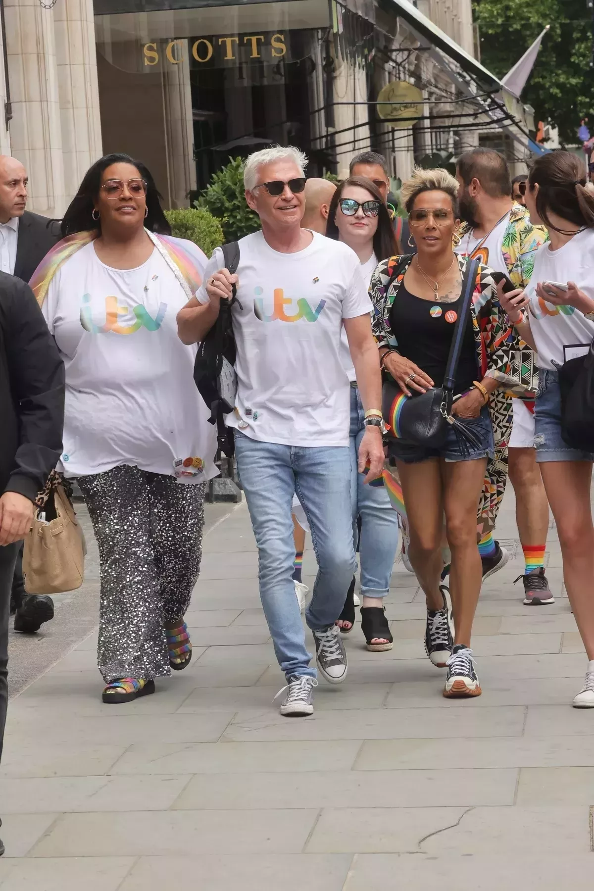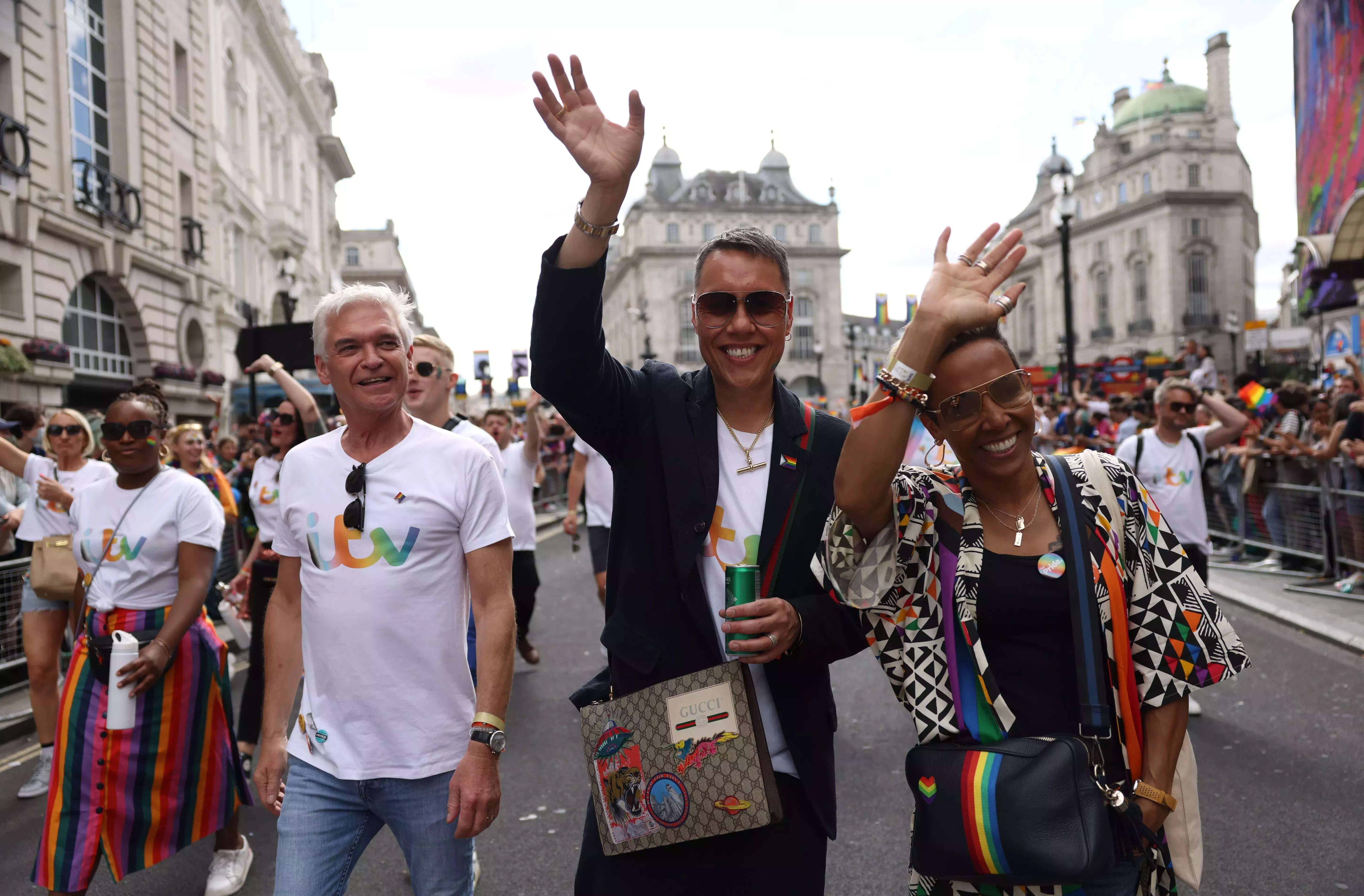 La atleta olímpica retirada, de 52 años, se unió ala presentador de This Morning y a su coprotagonista Alisson Hammond para el desfile anual LGBT+.