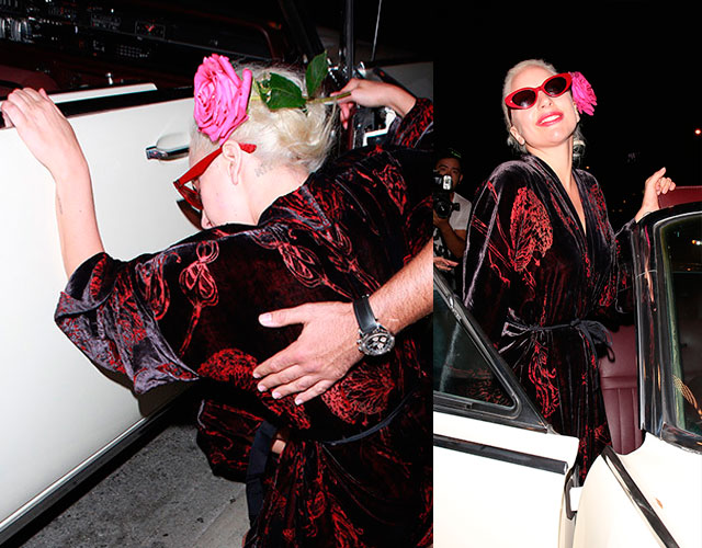 Pero parece que la artista salió con unas copas de más del loca: Lady Gaga borracha se acerca a su coche, ignorando a los periodistas que le preguntan por su carrera de actriz, y se cae al olvidarse de que existen las aceras. Aquí la tienes con ese look de divertidísima mamarracha con kimono, taconazos, gafas de sol y floripondio en la cabeza. A continuación puedes ver en bucle la maravillosa caída de Lady Gaga al salir de un restaurante.