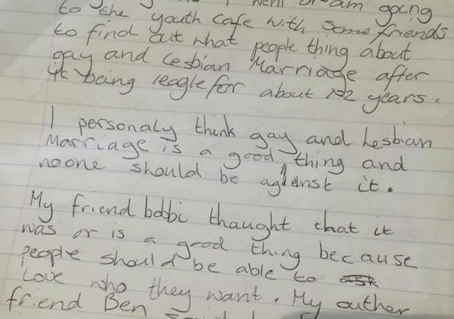 "En la noche del viernes escribo esto: fui al café de los jóvenes para ver qué opinaban sobre el matrimonio gay y lésbico. Personalmente creo que el matrimonio es una cosa buena y que nadie debería estar en su contra. Mi amiga Bobbi pensaba que era o es algo bueno porque la gente puede así querer a quién quiera. Mi otro amigo Ben digo que le parece perfecto porque él es bisexual. Mi otra amiga Aimee digo que le parecía correcto. Abbie en esta clase dijo que estaba bien y que era aceptable. Y Cameron B dijo que no le importa pero considera que es algo bueno".