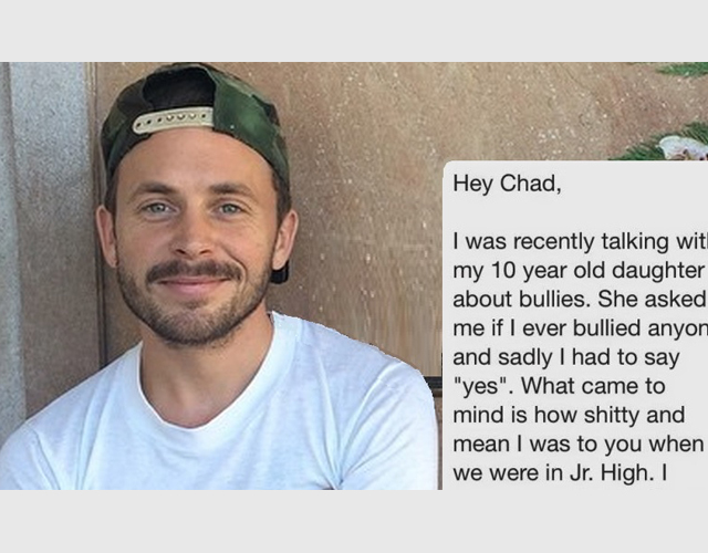 "Hola Chad, recientemente hablé con mi hija de 10 años sobre los abusones. Me preguntó si yo había abusado de alguien y lamentablemente tuve que decirle que sí. Me vino a la mente lo imbécil y malo que fui contigo en el instituto. Quiero pedirte perdón. Si viviéramos en el mismo estado lo haría cara a cara. Ni siquiera sé si me recuerdas, pero quiero y te pido perdón."
